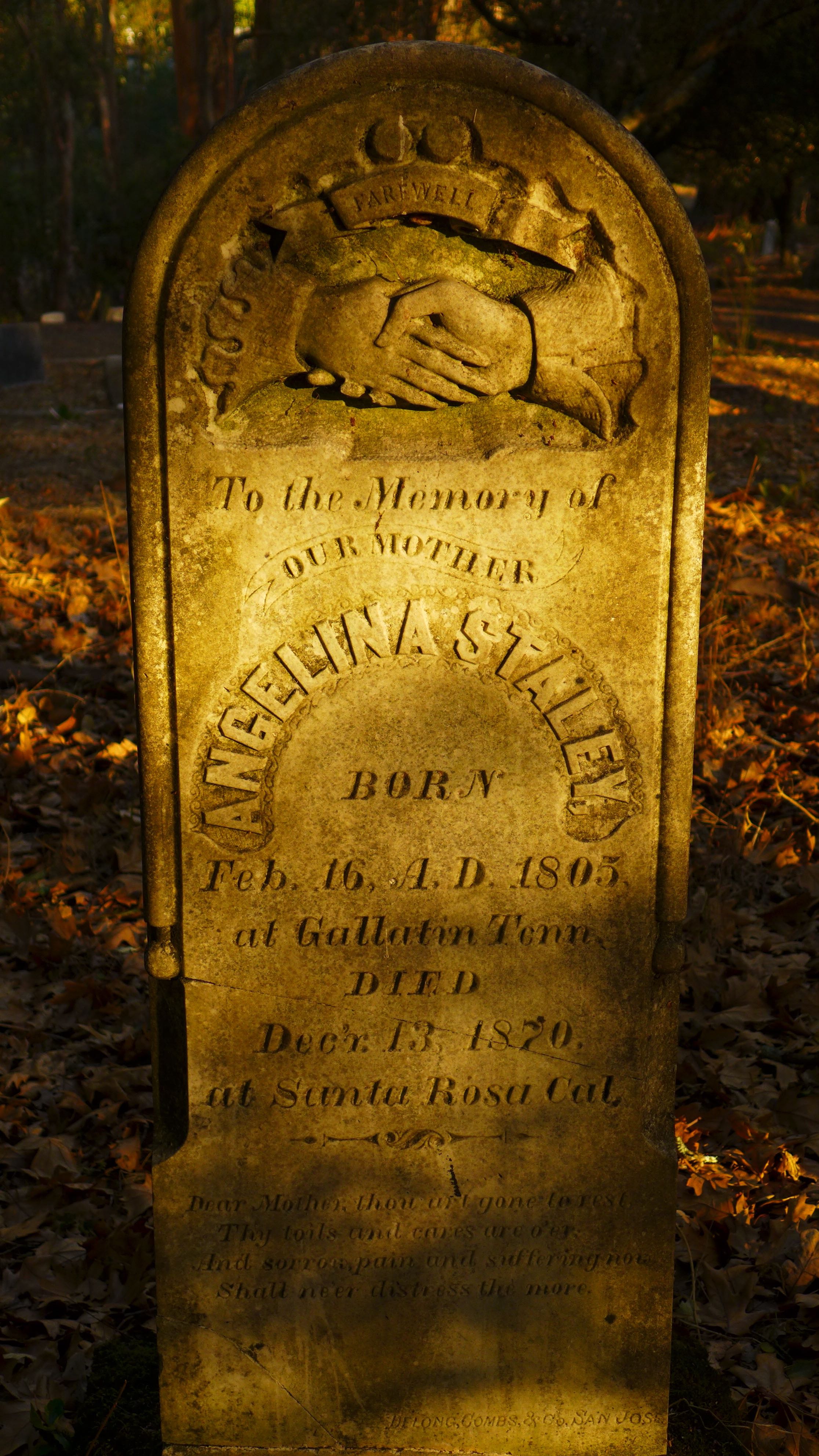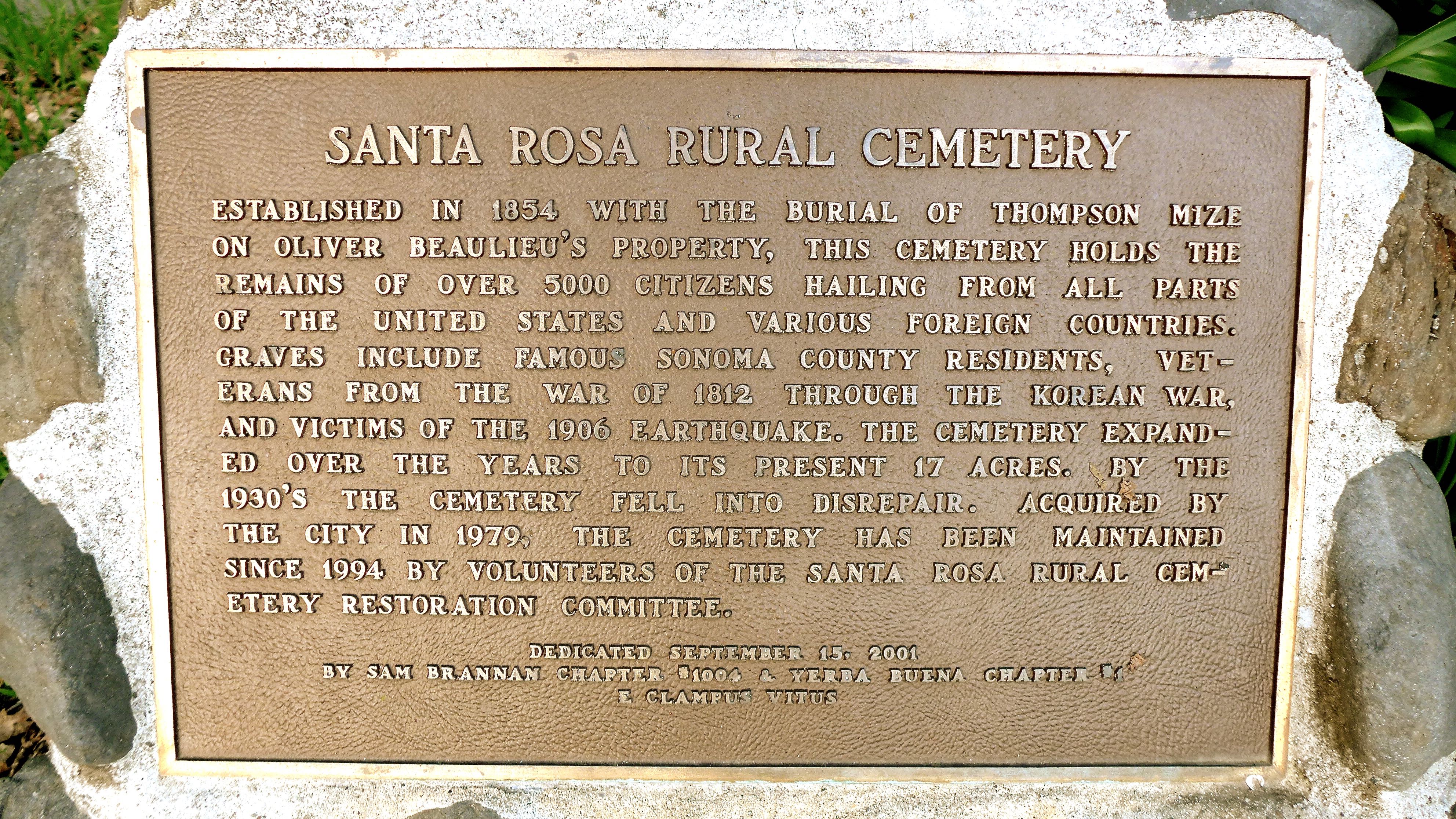 Santa Rosa Rural Cemetery. Although I’m not that much of a “tombstone tourist”, the S.R. Rural Cemetery is very cool. Besides its historical interest, the cemetery is interspersed with lots of trees. It provides a great walking experience as there are lots of oak tree – shaded trails, bordered by historic tombstones, to walk on. My sister, Toni, being a great fan of interesting cemeteries, would undoubtedly love the Santa Rosa Rural Cemetery!
