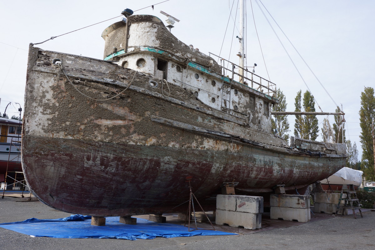 “Western Flyer”, the fishing boat used by John Steinbeck in his novel, “Cannery Row”. This boat was submerged in Anacortes, CA and after raising, it was transported to boat repair yard in Port Townsend, WA. Unfortunately, this derelict boat has yet to be repaired and owner is currently in arrears for boatyard storage fees.